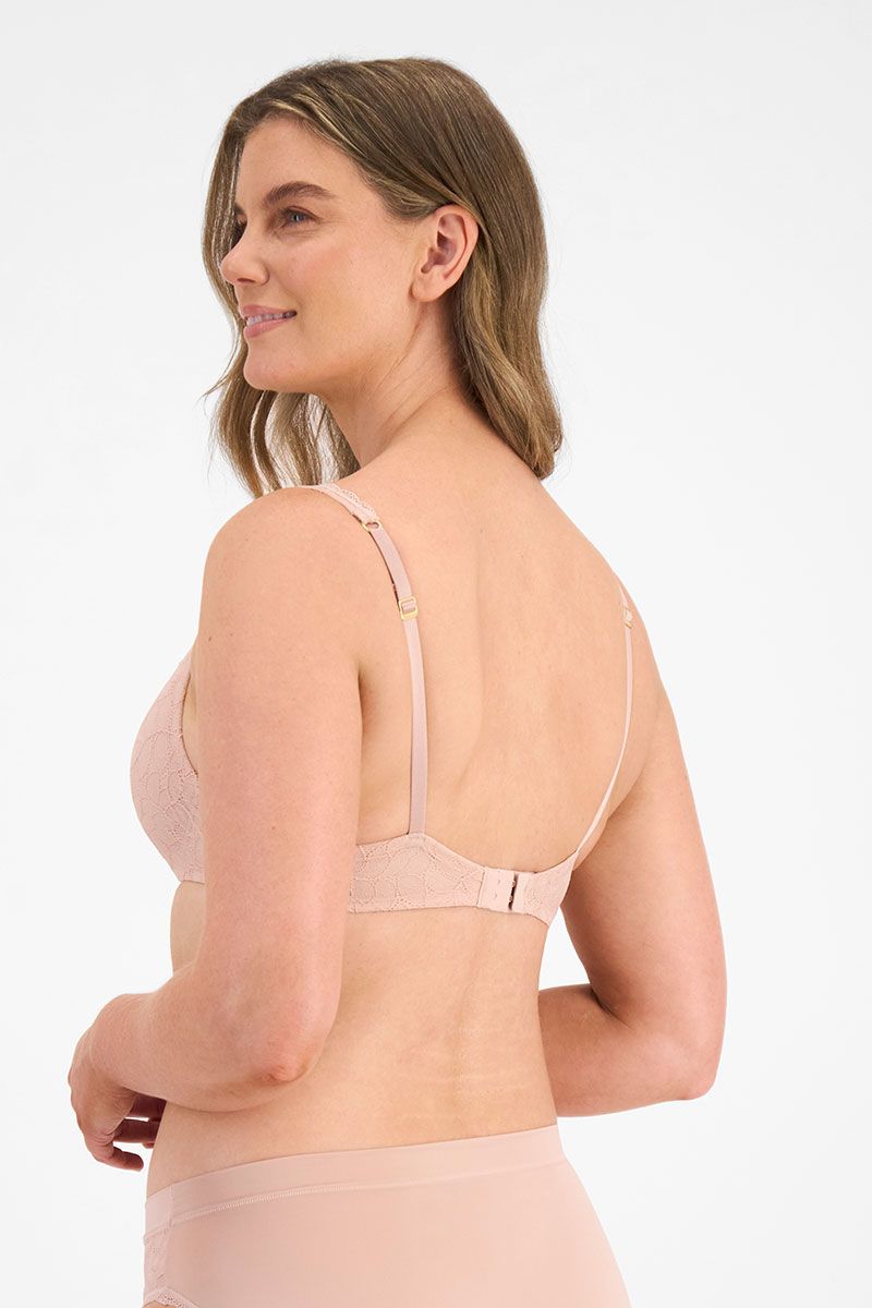 - Double layered back and padded hook and eye closure minimises dig for comfort that lasts all day